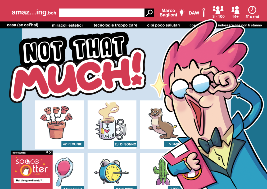 2023, by Marco Baglioni. Art by Davide "Daw" Berardi. Not That Much è un party game carta&matita da 3 a 100 giocatori, dove si devono indovinare i prezzi delle cose! In Not That Much uno dei giocatori sceglie un oggetto in vendita, ovunque su internet. Gli altri devono indovinarne il ...