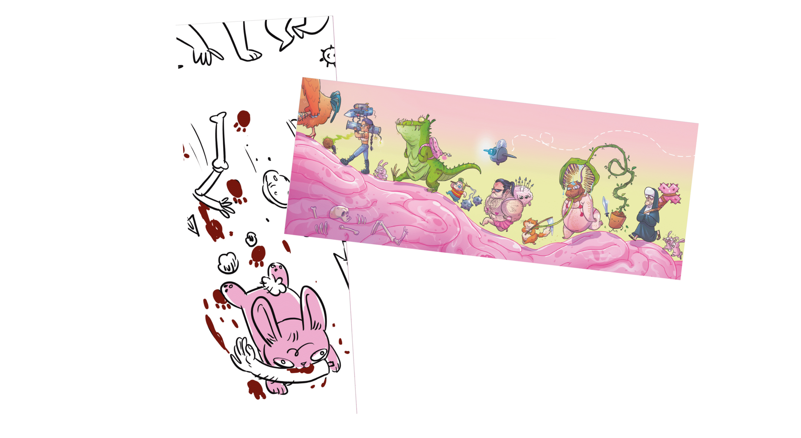 In DecKarnage, you play as a group of hapless characters in a fantasy world populated by the weirdest creatures ever seen. Your job? Scraping a living from what remains of battles between real heroes – the cool ones, not you – and monsters… But it’s a risky business, and it doesn’t always end as one might hope!